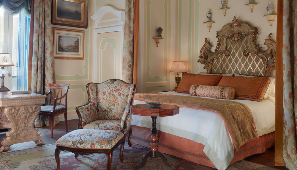 All rooms and suites are unique, and decorated in the grand style of a 15th-century Venetian palace – save for two suites which have more of a contemporary twist. Rich period colours, Venetian tapestries, handcrafted Girandole mirrors, Murano glass chandeliers and exquisite reproductions of rare Rubelli archival fabrics offer a visual treat. Bathrooms are composed of floor-to-ceiling Italian marble and stocked with Acqua di Parma amenities.