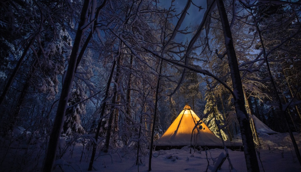 After helping us get settled into our tepee-style tents, each with three simple beds surrounding a wood-burning heater, our guide bids us farewell. He promises to return early the next morning to make coffee and breakfast (and says that if this were winter, he would definitely not be leaving us to fend for ourselves). For now, however, he’s jumping back in his boat and heading home to his family.
