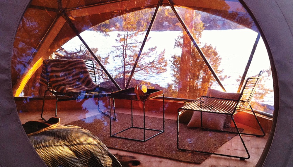 That hardship includes shared bathrooms (one each for two sets of four tents) and a do-it-yourself service mentality. But the magic of the Island Lodge lies in its simplicity. The island is more or less yours. (It’s available as either a buyout or a split, with two groups taking the two sides of the camp privately.) Its geodesic-dome tents, which are outfitted with reindeer-skin rugs and wood-burning stoves, are set just off a boulder-strewn shore, where you can sunbathe, swim, or fish for perch from the rocks. And a floating sauna deck— apparently a prerequisite for Swedish safari lodges—offers grab-and-go kayaks and paddleboards, and a jumping-off point for adventures in the archipelago.