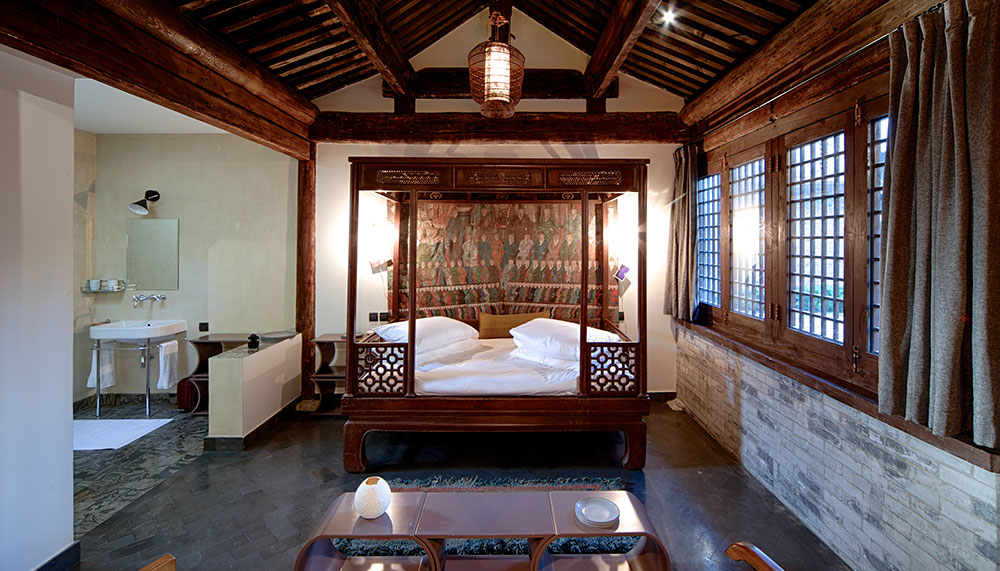 Artisans from around the country were tasked with keeping the layers of history intact, beginning with a painstaking restoration of the 300 year-old Tibetan Buddhist temple and its monks’ quarters that now house three guestrooms, each seriously upgraded with sleek polished concrete floors, contemporary Chinese art and well-appointed bathrooms. An elaborately carved canopied opium bed in one, Peony, is as striking to behold as it is cozy to sleep on. Sublime symmetry and magnificent craftsmanship run throughout this urban retreat, culminating in an adjoining building that houses Gathering Sky, the only James Turrell art installation in China.
