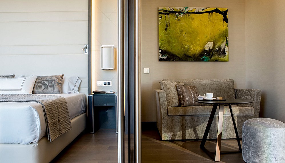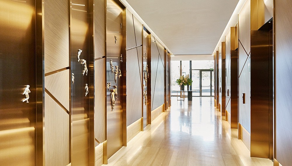 Though the hotel is located within the city’s historic centre — just steps from the Palacio Real, sprawling Casa de Campo park, and the 293-year-old Restaurante Sobrino de Botin (the oldest restaurant in the world) — it’s futuristic metal façade is a beacon of modernity. Inside, Spanish interior design firm Cuarto Interior has created public spaces that lean closer to art gallery than hotel lobby. Varying tones of light woods and subtly textured furnishings serve as a glamorous backdrop for playful gold leaf sculptures by Nacho Zebelu, and bold pieces by Dutch-born artist and architect Jan Hendrix. At the centre of it all is a towering, 24m-tall metal fibreglass waterfall sculpture by Catalan artist Pere Gifre, which tumbles down the wall of an interior courtyard.