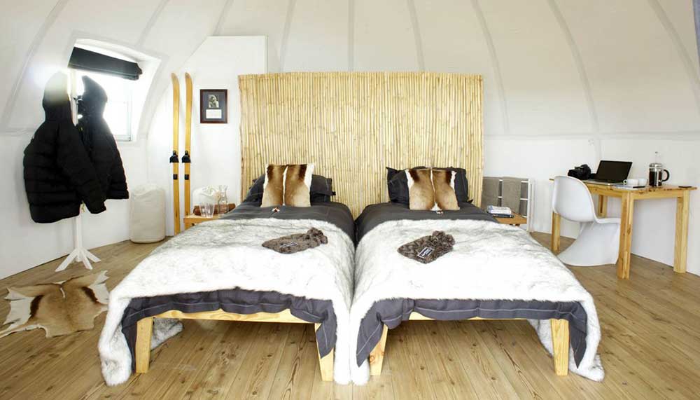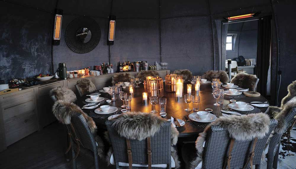The domed fibreglass sleeping pods, which provide guests with sumptuous, heated accommodations, have now been outfitted with en suite bathrooms. The camp’s newly renovated dining room includes a round oak table encircled by fur chairs. And a bespoke lounge with a library and bar has been added to the property.